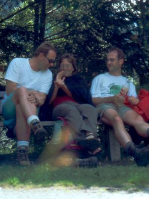 Nachdem wir uns gestärkt hatten ging es dann zügig auf einem Trampelpfad steil bergab nach Längenfeld Dort begaben wir uns als erstes zur Bushaltestelle um die genaue Abfahrtszeit zu verifizieren. Dies war durch den unübersichtlichen Fahrplan gar nicht so einfach. Kurz und bündig - als Resultat unserer Fahrplanstudie hatten wir noch eine Stunde Zeit zur freien Verfügung. So suchten wir uns in der Nähe ein schattiges Plätzchen, welches direkt an einem Fluss und Wanderweg gelegen war. Dort machte es sich jeder bequem und man versuchte die Zeit auf unterschiedlichste Weise zu überbrücken – schlafen, Mäxchen spielen (ohne Becher, nicht sehr erfolgreich), ... .