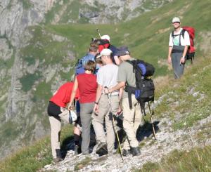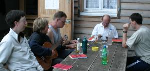 Sogar eine Gitarre gab es auf der Hütte und so war das Abendprogramm schon gerettet. Nachdem die langjährigen Teilnehmer von „Wolfgang’s Bergtouren“ ihre speziellen Liederbücher geholt hatten, überraschte Anja die Neuzugänge mit weiteren Kopien. So hatte nun jeder den Text vor Augen und nachdem Günther die Gitarre gestimmt hatte konnte uns nichts mehr aufhalten. Schon nach den ersten Liedern gesellten sich noch weitere Gäste zu uns. Auch den Wirtsleuten gefiel unser Gesang und so bekamen wir eine Flasche Wein spendiert. Um 22 Uhr beendeten wir unser Abendprogramm und suchten anschließend unser Matratzenlager auf.