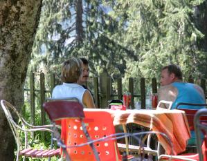 Rast unter Bäumen am SAC Hotel. Der gemischte Salat (Vitamine!) war sehr gefragt |
