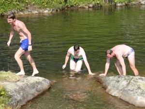 Genau nach einer halben Stunde erreichten wir um 17 Uhr das „Seeli“,! wie es kurz vorher auf einem Schild angeschrieben war. Die Temperatur des auf 2002m gelegen kleinen Sees konnte nicht genau bestimmt werden. Durchschwamm man nämlich den See wechselte sie von angenehm bis zu A***kalt. Eigentlich ein perfektes Kneipp-Bad. Nachdem wir uns im Wasser ausgetobt hatten war die Temperatur überall gleichmäßig kalt und die warmen Stellen waren nicht mehr auffindbar.