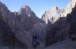 Der heutige Tag sollte uns ins Herz des Rosengartenmassivs führen. Frohgemut machten wir uns dann um 8 Uhr auf den Weg zum nahen Joch (2589m) und von dort wieder steil hinab ins Graßleitental. Im Anschluss daran ging es wieder hinauf zum Graßleitenpass und zur gleichnamigen Hütte (2601m).