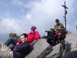 Der starke Südwestwind bläst uns dabei kräftig um die Ohren. Trotz des zeitigen Gipfelerfolgs um 9.30 Uhr war von der herrlichen Bergwelt nicht mehr allzu viel zu erkennen. Starker Dunst und viele Wolken verkürzten die Sicht wesentlich. Trotzdem genossen wir die zünftige Gipfeljause am Gipfelkreuz des Badus (2928m), noch nicht wissend, dass wir die nächsten beiden Tage keinen Gipfel mehr erreichen würden.