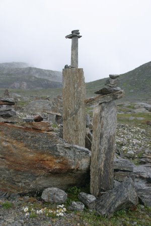 Die Wegführung der Alternativroute war auch bei den schlechten Sichtverhältnissen sehr gut zu finden und manchmal riss die Wolkendecke kurzzeitig auf, um einen Blick auf das schöne Hochtal freizugeben. Gespenstisch tauchte vor uns dann eine Stadt aus Steinmännern auf, die wir durchquerten.