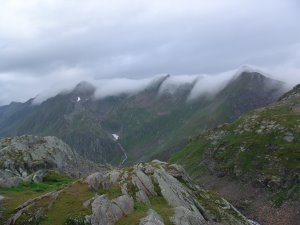 Als sich auch gegen Mittag noch keine wesentliche Wetterbesserung eingestellt hatte, machten wir uns um 12 Uhr auf den Weg zum Passo Borengo (2632m). Unter diesen Wetterbedingungen war es natürlich klar, dass wir die Besteigung des Piz Ravetsch und die Überschreitung des Piz Borrel für diesen Tag streichen mussten.